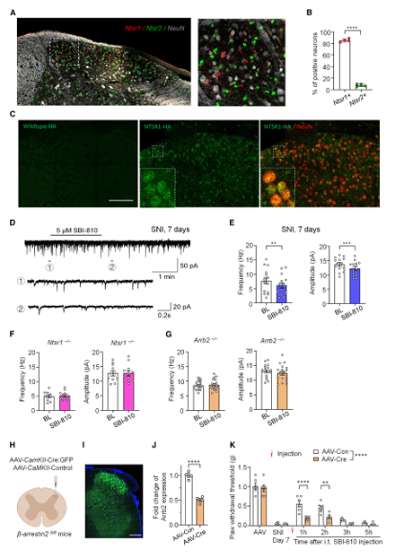 為了進一步驗證SBI-810對脊隨神經(jīng)可塑性的中樞調節(jié)作用,作者檢測了脊髓背角(SDH)中對疼痛調節(jié)至關重要的NTSR1和NTSR2的表達。研究結果表明, 調節(jié)脊髓傷害感受神經(jīng)元中的突觸傳遞、NMDAR表面表達和功能以及細胞外調節(jié)蛋白激酶(ERK) 激活, 是SBl-810通過βarr2介導的NTSR1信號傳導來減輕疼痛的關鍵機制。