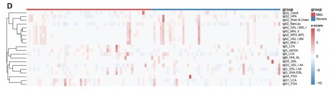 通過對比流感患者與健康對照者、輕癥與重癥流感患者的免疫球蛋白糖基化譜差異,該研究團隊共篩選出20個差異表達糖基化位點,最終7個位點納入免疫球蛋白糖基化譜重癥識別算法(IGPSSIA),為重癥早期診斷提供了新的生物標(biāo)志物,也為臨床進行及時干預(yù)、改善患者預(yù)后提供了評估工具。同時發(fā)現(xiàn),重癥流感患者IgM、IgG4、IgA2上高甘露糖結(jié)構(gòu)增加,IgG1上甘露糖殘基減少,為流感的治療靶點研究提供了新的思路。