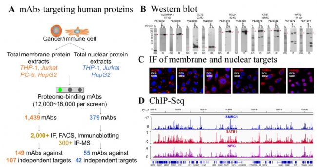 為進(jìn)一步評估PETAL在蛋白質(zhì)組水平抗體開發(fā)中的可行性,研究人員提取多種人源細(xì)胞系的膜蛋白與核蛋白組分,通過批量篩選成功獲得了149個膜蛋白特異性單抗及55個核蛋白特異性單抗。經(jīng)嚴(yán)格的特異性驗證,這些抗體均可成功應(yīng)用于免疫熒光(IF)、染色質(zhì)免疫沉淀測序(ChIP-seq)等多種常用實驗技術(shù)。