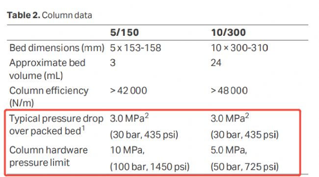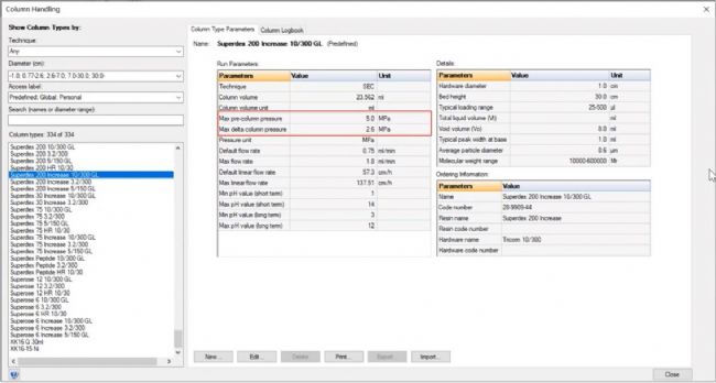 在說明書上的column data中,可以查看層析柱的最大耐壓。Column hardware pressure limit對應(yīng)PreC pressure,Typical pressure drop over packed bed對應(yīng)DeltaC pressure。