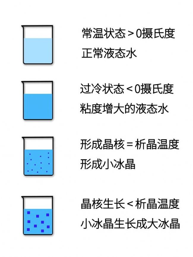 需要特別說明的是,常壓下的0℃指的是冰的融化溫度,而非析晶溫度,實(shí)際結(jié)晶過程往往發(fā)生在更低的溫度。此外,液態(tài)水的析晶溫度會(huì)隨氣壓升高而降低。