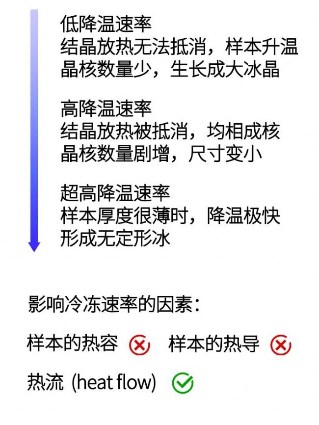 其次,理解冷凍速率也至關(guān)重要。在較低冷凍速率下,水結(jié)晶所釋放的潛熱無法被及時(shí)導(dǎo)出,導(dǎo)致樣品溫度出現(xiàn)波動(dòng)。這種溫度變化會(huì)引起冰晶的反復(fù)成核、局部融化與再次生長(zhǎng),最終形成尺寸較大的晶體。隨著冷凍速率提高,外界能更有效地移走結(jié)晶熱,使得體系快速通過冰晶生長(zhǎng)的溫區(qū)。此時(shí)晶核生成數(shù)量顯著增加,但生長(zhǎng)時(shí)間有限,因此形成的冰晶尺寸較小。