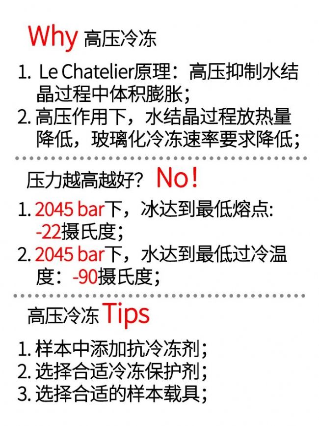 在高壓條件下,水結(jié)晶時(shí)所釋放的潛熱顯著降低,從而減少了對(duì)環(huán)境熱交換速率的要求。這意味著實(shí)現(xiàn)玻璃化冰所需的臨界冷凍速率也隨之降低,因此更容易獲得高質(zhì)量玻璃態(tài)冰,最大限度地保留樣品的原始超微結(jié)構(gòu)。