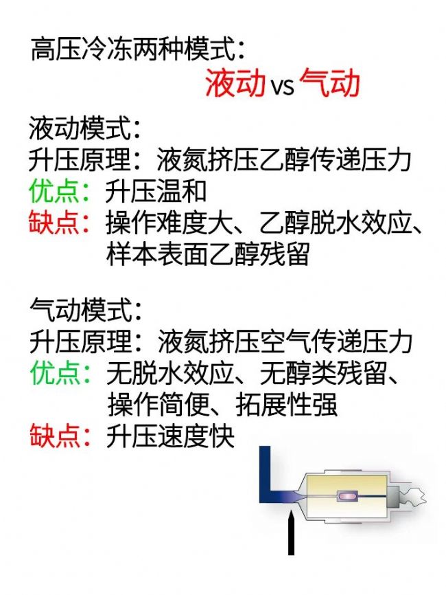 其原理是通過液氮擠壓乙醇產(chǎn)生高壓,壓力經(jīng)乙醇傳遞至樣品,隨后液氮迅速替換乙醇并實(shí)現(xiàn)快速冷凍。該模式的優(yōu)點(diǎn)在于壓力上升過程較為平緩,對(duì)樣品載具的機(jī)械強(qiáng)度要求相對(duì)較低。然而,該方式也存在顯著缺點(diǎn):乙醇在壓力傳遞過程中會(huì)直接接觸樣品,可能導(dǎo)致樣本脫水并引入結(jié)構(gòu)偽影;同時(shí),載具周圍殘留的乙醇不易被完全清除,可能干擾后續(xù)觀察或分析。此外,為盡量減少乙醇對(duì)樣品的化學(xué)影響,操作須極為迅速,對(duì)實(shí)驗(yàn)人員的技術(shù)要求較高。