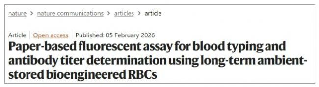 [1] Xiaohui Wang. et al. Paper-based fluorescent assay for blood typing and antibody titer determination using long-term ambient-stored bioengineered RBCs. Nature Communications. 2026.