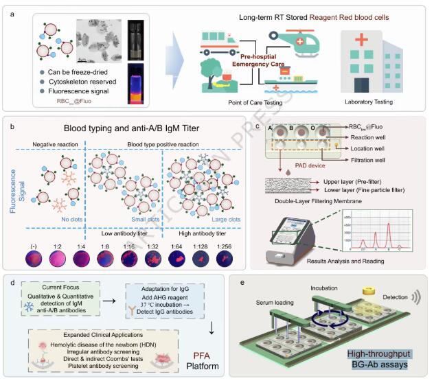 2026 年 1 月,中國科研團隊于Nature Communications 發(fā)表研究結果,在床旁血型鑒定及抗體滴度檢測技術研究中取得了新進展。開發(fā)了一種基于生物工程紅細胞 (RBCbm@Fluo) 的用于血型鑒定及抗體滴度檢測的新型手持式紙基檢測 POCT 方法。