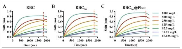 (2) 然后結合 RBC、RBCbm 和 RBCbm@Fluo 紅細胞(稀釋至 1×108 cells/mL);