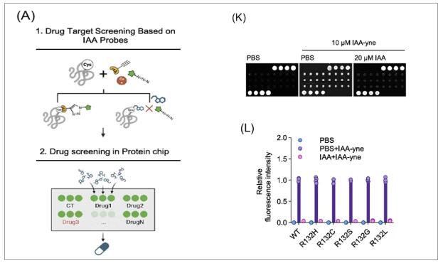 (一)、Ccc-Chip 平臺驗證:該原理基于競爭性結合(圖4A),將靶蛋白固定在芯片上,如果待測分子能與靶蛋白半胱氨酸共價結合,就會與帶標記的探針(IAA-yne)競爭,導致熒光信號減弱。研究團隊首先在 P50、AKT1、KRASG12C 等蛋白芯片上驗證了方法的可行性,并針對 mIDH1 蛋白芯片系統優(yōu)化了探針濃度、點擊化學反應液和蛋白濃度,為后續(xù)高通量篩選奠定基礎。