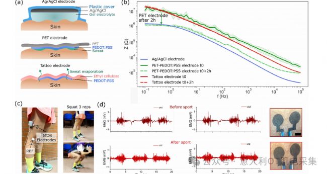 實驗結果表明,紋身電極內部存在天然的多孔結構,液態(tài)水滲透率可達26.8 L m⁻² h⁻¹ bar⁻¹,WVTR約為70 g m⁻² h⁻¹,遠高于人體正常經皮水分流失率(4–8 g m⁻² h⁻¹)。EIS結果顯示,紋身電極在佩戴2小時內阻抗穩(wěn)定,未出現濕界面形成,說明其具備良好的透氣性和干界面穩(wěn)定性。在運動實驗中,電極在劇烈出汗條件下仍能保持干爽,EMG信號質量穩(wěn)定。
