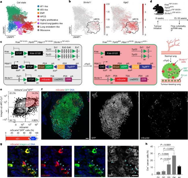 通過篩選,研究者發(fā)現(xiàn)Slc4a11是KP LUAD模型中HPCS細(xì)胞的特異性標(biāo)志物(圖1a)。借此標(biāo)志物,研究者構(gòu)建了一整套報(bào)告系統(tǒng),用于對HPCS細(xì)胞進(jìn)行可視化、分離、譜系示蹤和耗竭。