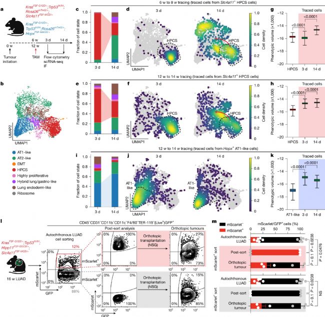為了對比HPCS與AT1樣細(xì)胞的可塑性,研究者也在AT1細(xì)胞標(biāo)志物Hopx基因后敲入了FSF-mScarlet-AkaLuc-CreER-DTR(簡稱FSF-MACD),并構(gòu)建了KPfrt;HopxMACD/+;Rosa26mTmG/+小鼠。經(jīng)過與上述一致的TAM誘導(dǎo)示蹤后,針對示蹤的AT1樣細(xì)胞進(jìn)行scRNA-seq分析顯示。結(jié)果表明,在晚期(12周)腫瘤中分選出的示蹤AT1樣細(xì)胞內(nèi)始終維持在AT1樣狀態(tài),且被示蹤細(xì)胞的表型體積實(shí)際上發(fā)生了收縮(圖2i–k)。這說明僅有HPCS具有高度可塑性,而且會(huì)由HPCS產(chǎn)生具有固定表型和低可塑性的癌細(xì)胞狀態(tài),例如AT1樣狀態(tài)。