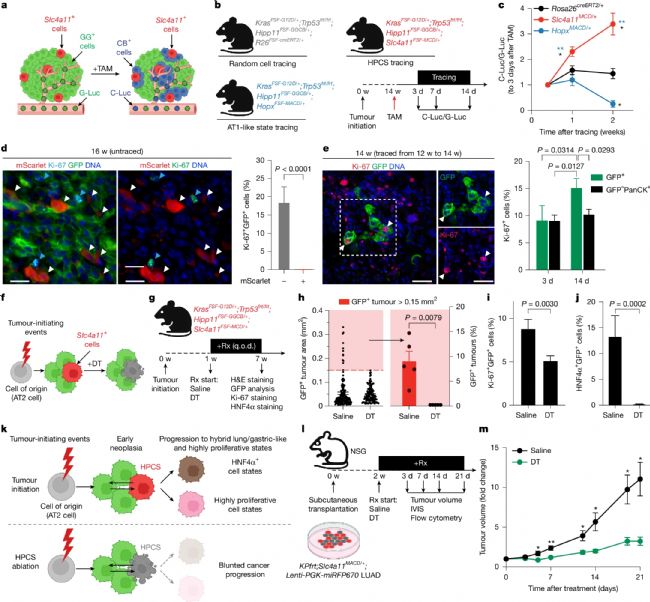 由于HPCS在腫瘤發(fā)生早期出現(xiàn)并產(chǎn)生進(jìn)展期細(xì)胞狀態(tài),研究者認(rèn)為其在早期腫瘤進(jìn)展中起著關(guān)鍵作用。因此,研究者在腫瘤誘導(dǎo)后第1周開始至第7周,通過連續(xù)全身性給予白喉毒素(DT),將KPfrt;Slc4a11MCD/+;Hipp11GGCB/+小鼠中的HPCS進(jìn)行細(xì)胞剃除。結(jié)果表明,DT組的總腫瘤負(fù)荷顯著降低,未出現(xiàn)大尺寸(>0.15 mm²)的腫瘤病變(圖3h)。HPCS的細(xì)胞剃除抑制了具有高增殖率或表達(dá)HNF4α的兼具肺和胃樣特征的混合細(xì)胞狀態(tài)的出現(xiàn)(圖3i-j),這些結(jié)果表明,HPCS對于增生性病變的起始并非必需,但對于這些腫瘤的進(jìn)展至關(guān)重要。