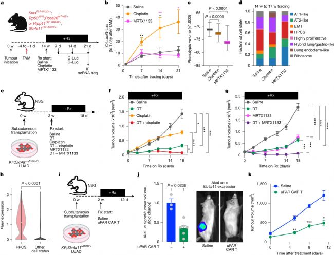 研究者繼續(xù)在KPfrt;Slc4a11MCD/+;Hipp11GGCB/+小鼠中進(jìn)行兩種給藥測試(順鉑化療與靶向KRAS(G12D)的MRTX1133),探究HPCS是否產(chǎn)生治療抵抗?fàn)顟B(tài)的細(xì)胞類型(圖4a)。結(jié)果發(fā)現(xiàn),治療反應(yīng)主要清除非HPCS來源的細(xì)胞,而HPCS來源的細(xì)胞顯著富集(圖4b)。