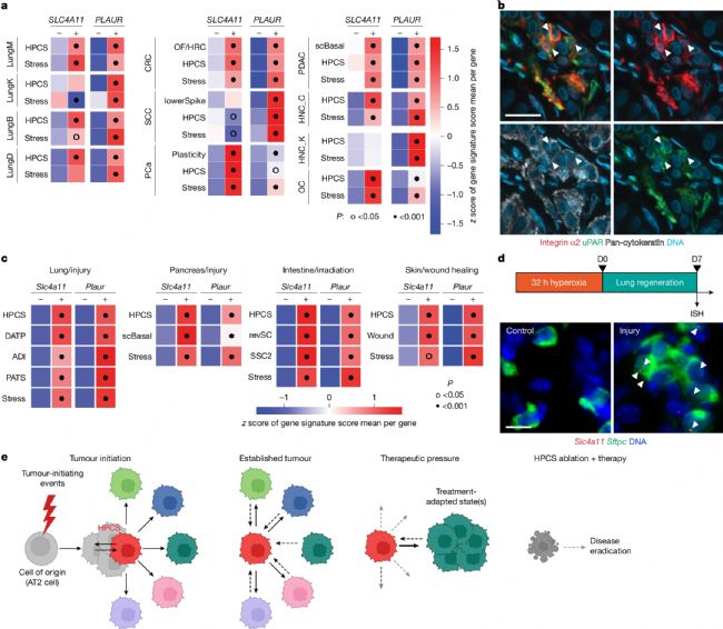 鑒于HPCS在LUAD中的關(guān)鍵作用,研究者推測HPCS可能反映了多種癌癥中共有的關(guān)鍵癌細(xì)胞狀態(tài)。研究者在結(jié)直腸癌、頭頸癌、肺腺癌、卵巢癌、胰腺導(dǎo)管腺癌、前列腺腺癌和皮膚鱗狀細(xì)胞癌的單細(xì)胞數(shù)據(jù)集中均確認(rèn)了HPCS特征的存在(圖5a)。在人類LUAD組織中,SLC4A11、PLAUR、HPCS特征與應(yīng)激程序同樣相關(guān)(圖5b)。而這一相關(guān)性同樣出現(xiàn)在小鼠的肺損傷后肺泡、胰腺、腸道和皮膚的損傷相關(guān)再生上皮中(圖5c-d),這一發(fā)現(xiàn)提示腫瘤可能通過“劫持”機(jī)體固有的再生與修復(fù)程序,獲得持續(xù)進(jìn)行細(xì)胞狀態(tài)轉(zhuǎn)換的能力,從而在治療壓力下不斷“進(jìn)化升級”,獲得長期生存優(yōu)勢。