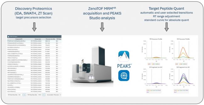 Figure 1. Comprehensive Workflow for MRMHR-based Peptide Quantitation in PEAKS Studio. A. PEAKS Studio supports discovery proteomics data acquired using ZenoTOF 7600 or 8600 systems. Using a novel tool, Transition List Generator, users can create the precursor list of desired targets and export it in a format directly supported by SCIEX OS. B. Output precursor list is imported and acquired using SCIEX MRMHR methodology. C. PEAKS Studio MRMHR data analysis includes automated, or user directed Target Peptide Quantification.