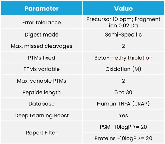 用胰蛋白酶對(duì)TNF-α蛋白進(jìn)行酶解,酶解后的肽段通過(guò)ZenoTOF 7600系統(tǒng)的自動(dòng)化DDA方法結(jié)合 CID進(jìn)行分析。簡(jiǎn)要步驟如下:取100 ng TNF-α樣品,用10% N-octyl-glucoside使蛋白變性;加入50 mM TCEP,60°C還原1小時(shí);室溫下加入200 mM methylmethane-thiosulfonate孵育10分鐘;加入酶解緩沖液稀釋后,胰蛋白酶37°C孵育過(guò)夜;用10%甲酸終止酶切。定量分析時(shí),用水稀釋樣品以制備標(biāo)準(zhǔn)曲線標(biāo)品。