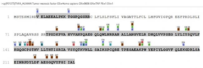 Figure 2. Sequence coverage view in PEAKS Studio for TNFA_HUMAN (P01375).