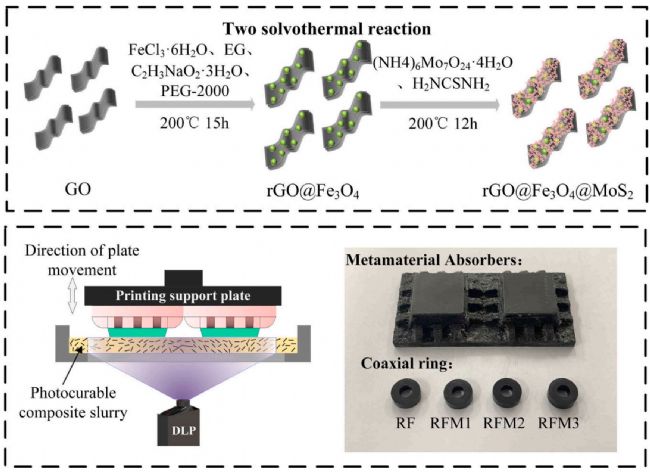 案例一:Digital light processing of 3D-printable all-dielectric metamaterial absorbers based on reduced graphene oxide@Fe3O4 and reduced graphene oxide@Fe3O4@MoS2 composites