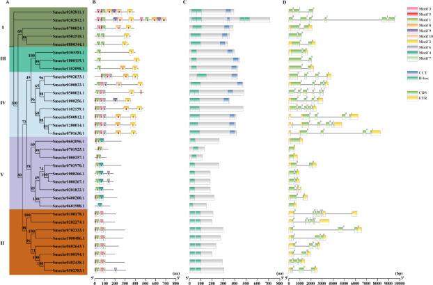 圖3. 茄子中潛在BBX家族基因的系統(tǒng)發(fā)育關(guān)系、基序、結(jié)構(gòu)域及基因結(jié)構(gòu)