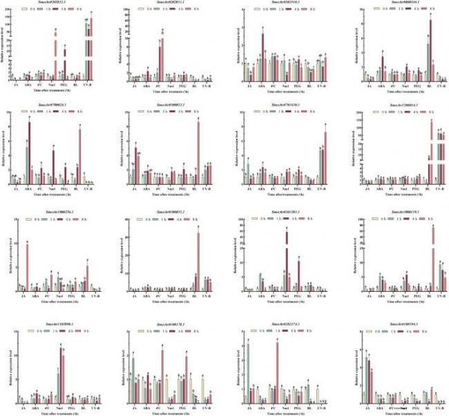 圖8. 基于qRT-PCR的SmBBX基因在不同處理(包括JA、ABA、4°C、NaCl、PEG、藍光和UV-B處理)下的表達模式分析