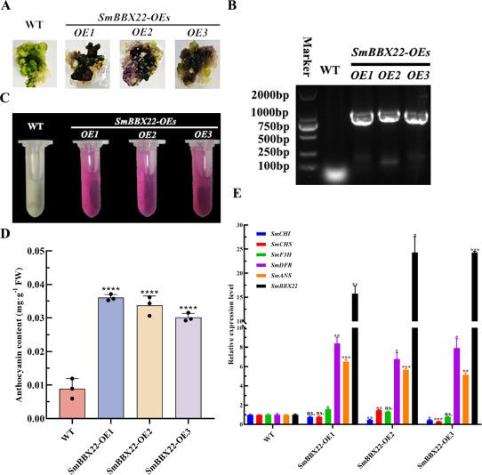 圖12. 茄子愈傷組織中SmBBX22過表達的表型及結(jié)構(gòu)基因表達水平分析