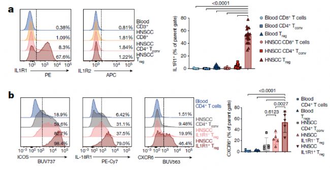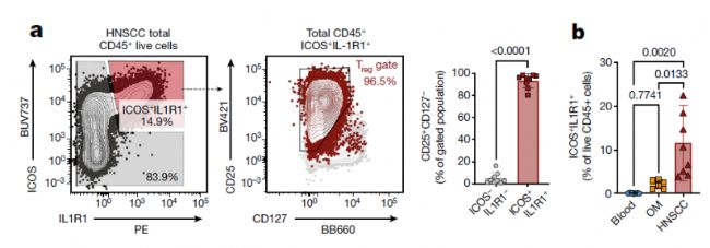 鑒于流式和單細胞RNA測序(scRNA-seq)均顯示HNSCC腫瘤Tregs細胞存在差異,作者進一步對Treg-APC的相互作用進行了驗證。通過流式分析發(fā)現(xiàn),IL1R1(在T細胞與APC通訊中富集)特異性地表達在腫瘤浸潤的Treg細胞上(Figure 2a)。幾乎所有的IL1R1+ T細胞都共表達ICOS、IL-18R1以及趨化因子受體CXCR6(Figure 2b)。
