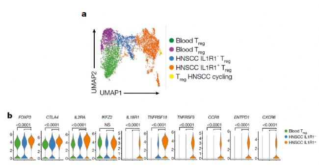 為了更清晰地區(qū)分腫瘤浸潤的IL1R1+ Treg細胞和IL1R1- Treg細胞,作者從OM、HNSCC以及外周血中分選了Treg細胞,并結(jié)合免疫響應(yīng)基因panel進行單細胞RNA測序。