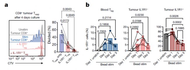 在CD8+ T細胞及CD4+ T細胞的體外增殖抑制實驗中,IL1R1+ Treg細胞展現(xiàn)出了比IL1R1- Treg細胞更有效的抑制效果(Figure 4a)。另外,通過anti-CD3、anti-CD28和anti-CD2磁珠刺激,腫瘤浸潤IL1R1+ Treg細胞中IL1R1的表達在第1天升高,第2-3天下降(Figure 4b)。這一現(xiàn)象提示,IL1R1+ Treg細胞能夠應(yīng)答TCR信號并調(diào)控IL1R1的表達。