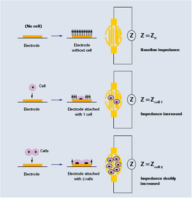 作為無標(biāo)記生物檢測技術(shù)領(lǐng)域的一項(xiàng)創(chuàng)新,羅氏應(yīng)用科學(xué)部的xCELLigence系統(tǒng)提供這樣一種無需標(biāo)記、同時(shí)又可對細(xì)胞進(jìn)行實(shí)時(shí)監(jiān)測的新型細(xì)胞分析平臺(tái)。細(xì)胞接種在96微孔E-plate中,在每個(gè)孔的底部有嵌入的微電子感應(yīng)器,微電極阻抗主要由點(diǎn)及周邊的離子環(huán)境決定,當(dāng)電場加在上面的時(shí)候可以測量到一個(gè)基線阻抗,細(xì)胞的有無以及貼壁程度的改變都會(huì)影響電極傳感器表面電子和離子的通過。因此,細(xì)胞在檢測板上的貼壁、黏附、生長等狀況與傳感器所測量得到的阻抗相對應(yīng)。根據(jù)阻抗得到的指數(shù),反映了細(xì)胞增殖、存活、凋亡、形態(tài)變化等細(xì)胞生物學(xué)狀態(tài)。