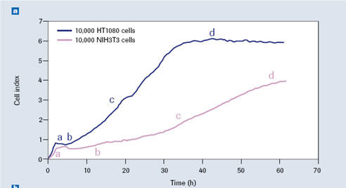 圖 2: NIH3T3 和 HT1080細(xì)胞的動(dòng)力學(xué)增殖曲線:a. 細(xì)胞黏附和延展階段 b. 每個(gè)細(xì)胞株特有的停滯階段 c. 指數(shù)生長期 d.融合階段