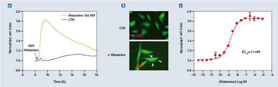 G蛋白偶聯(lián)受體(GPCR)是藥物研發(fā)的重要靶點(diǎn),市場上大約50%的藥物都是針對GPCR的。已知GPCR會(huì)調(diào)節(jié)肌動(dòng)蛋白細(xì)胞骨架,因此可以利用這個(gè)信息來作為GPCR活性的功能和生物相關(guān)的參照。如圖3a所示,表達(dá)人H1組胺受體的CHO-K1細(xì)胞接種在E微孔板中,并用組胺刺激。組胺誘導(dǎo)產(chǎn)生了一個(gè)與肌動(dòng)蛋白細(xì)胞骨架重排相關(guān)的瞬時(shí)的細(xì)胞信號(圖3b)。對組胺濃度取對數(shù)與最大細(xì)胞反應(yīng)做圖,就產(chǎn)生了一個(gè)EC50值的劑量應(yīng)答曲線(圖3c)。xCELLigence系統(tǒng)對于GPCR分析最大的貢獻(xiàn)有幾部分:首先,因?yàn)樽x數(shù)是非損傷性的,細(xì)胞可以在多個(gè)時(shí)間點(diǎn)進(jìn)行刺激評估脫敏作用和其他受體類型的干擾。第二,除了偶聯(lián)Gq亞家族G蛋白的組胺受體,表達(dá)其他偶聯(lián)Gs和Gi受體的細(xì)胞也可以用xCELLigence系統(tǒng)來監(jiān)測。以前進(jìn)行不同信號通路的GPCR分析需要幾個(gè)不同的儀器。第三也是最重要的,表達(dá)內(nèi)源GPCR的細(xì)胞包括原代細(xì)胞也可以用xCELLigence系統(tǒng)來分析,無需過表達(dá)外源GPCR或改造細(xì)胞表達(dá)多種GPCR。這樣就可以真實(shí)評估生理?xiàng)l件適當(dāng)?shù)募?xì)胞類型的受體。除了GPCR,其他重要藥物靶點(diǎn)的受體類型,比如酪氨酸激酶受體,也可以通過xCELLigence系統(tǒng)來進(jìn)行細(xì)胞功能的分析。