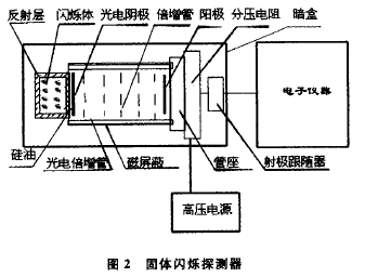 1.1.1固體閃爍探測器:通常將閃爍體、光電倍增管和前置放大器都裝在一個光屏蔽暗盒中,閃爍體外填充或涂有反射層,閃爍體和光電倍增管之間加有光學耦合劑,必要時還可以加光導(dǎo)。高壓電源通過焊在管座上的分壓電阻把電壓加在光電倍增管的各個極上。如圖2所示。目前在免疫計數(shù)器中、碘化鈉(鉈)晶體應(yīng)用最多,它的化學符號為NaI(T1)。它是鉈激活的碘化鈉透明單晶。其特點:密度大,平均原子序數(shù)高;能量轉(zhuǎn)換效率高;對γ射線有較好分辨力,制備較容易,價格也比較便宜,但極易潮解,必須密封在帶有光學玻璃片的鋁容器或其它金屬容器中使用。固體閃爍探測器也廣泛應(yīng)用在其它核醫(yī)學儀器設(shè)備上,例如SPECT、PET-CT等。