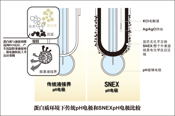 測量困境:在測量乳制品等含蛋白質(zhì)物質(zhì)環(huán)境下,傳統(tǒng)的pH電極應(yīng)用滲透式參比電極系統(tǒng),含不同氨基酸成分的蛋白質(zhì)待測液會(huì)通過有孔的液接界與電解液中的KCL發(fā)生化學(xué)反應(yīng),形成的沉淀或生成的化學(xué)結(jié)晶會(huì)堵塞有孔液接界,從而導(dǎo)致液接界阻抗增高,使得電極反應(yīng)速度慢, 影響正常的pH測量。
