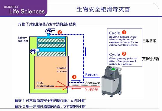 通常蒸汽回路連接于安全柜排風過濾器的后面,當然確切的連接類型和位置取決于帶消毒的生物安全柜的型號。在更換過濾器或?qū)Π踩襁M行維護時,這種連接會推送過氧化氫蒸汽穿過安全柜的排風過濾器并將其徹底消毒。