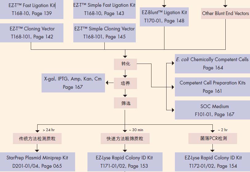 GenStar公司現(xiàn)階段提供兩套PCR克隆系統(tǒng):用于克隆含有3’-端突出A堿基的PCR產(chǎn)物的EZ-T載體及其相應(yīng)的快速連接反應(yīng)試劑盒,以及用于克隆不含3’-端突出堿基的平末端PCR產(chǎn)物的EZ-Blunt平端載體及其相應(yīng)的連接反應(yīng)試劑盒。同時(shí),GenStar公司開(kāi)發(fā)了一款新型的EZ-Lyse克隆快速檢測(cè)試劑盒,方便研究者短時(shí)間內(nèi)快速篩選到目的克隆,進(jìn)行后續(xù)實(shí)驗(yàn)