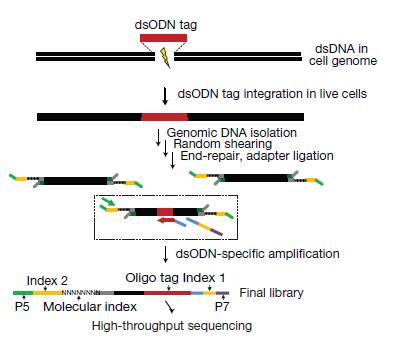 圖3. Guide-seq 的流程。摘自Tsai SQ等, GUIDE-seq enables genome-wide profiling of off-target cleavage by CRISPR-Cas nucleases. Nat Biotechnol. 2014 Dec 16.