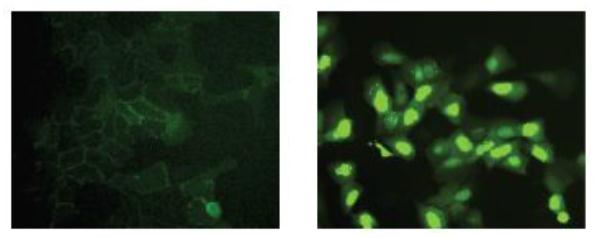 圖2 所示圖像由10 倍物鏡獲得。正常表達Wnt 蛋白,EGFP 模糊可見分散在細胞膜上,并沒有在細胞核中積累(左)。GSK-3ß處理后,EGFP 熒光轉移到核中(右)。