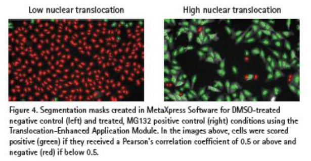 MetaXpress® 軟件中的Translocation-Enhanced 應用模塊可以被用來鑒定核中以及定量與細胞核相關的其余部分中ß-catenin-EGFP 的量(圖3)。對細胞核區(qū)間的劃分來源于被Hoechst 核染料染色的區(qū)域。然后用第二種波長的光(EGFP)將細胞劃分出新的區(qū)間,這一區(qū)間的大小和寬度可以滿足特異性的檢測。這保證了每個區(qū)間都有足夠的綠色熒光強度,如細胞核,細胞質和細胞膜都可以進行定量分析。交互式模塊隨著參數的調整可以及時的反饋信息,這也使我們能對每個特定的檢測結果進行準確分析。