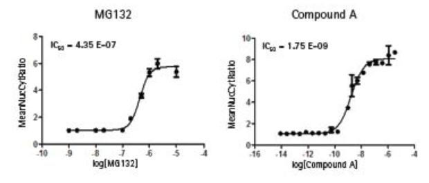 圖5 濃度相關曲線如圖所示,左為陽性化合物MG132,右為樣品化合物A。根據細胞核和細胞質的平均熒光強度比值得出IC50。陽性化合物的Z 值大于0.7 說明實驗重復性好。