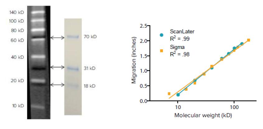 圖2:遷移vs分子量。將7個(gè)蛋白在ScanLater免疫印跡蛋白質(zhì)梯上的遷移距離繪制及擬合為各自的分子量的函數(shù)。其線性關(guān)系與購(gòu)置于Sigma公司的參照蛋白(貨號(hào).#B2787)結(jié)果相類似。