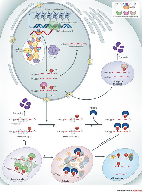 N6-甲基腺嘌呤(m6A)是真核生物最常見和最豐富的RNA分子修飾。m6A修飾是METTL3甲基轉(zhuǎn)移酶復(fù)合體催化的,而最近新發(fā)現(xiàn)的RNA去甲基化酶FTO 和ALKBH5 可以通過一種α-酮戊二酸和Fe2+依賴型的形式對(duì)m6A去甲基化。METTL3, FTO和 ALKBH5被證明在很多生物過程中起重要作用,從發(fā)育和代謝到生殖。m6A存在于很多物種質(zhì)中,占到了RNA堿基甲基化修飾的80%。m6A主要分布在mRNA中,也出現(xiàn)在非編碼RNA如tRNA, rRNA和snRNA。在轉(zhuǎn)錄成的RNA中相對(duì)高的m6A含量會(huì)影響RNA的代謝過程,比如剪切,核轉(zhuǎn)運(yùn),翻譯能力和穩(wěn)定性,以及RNA轉(zhuǎn)錄。