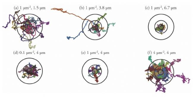 當(dāng)細(xì)胞培養(yǎng)在長度(1.5μm、4μm和6.7μm)不同的納米線(直徑為80nm,密度為1μm-2)時(shí),細(xì)胞表現(xiàn)出依賴于長度的遷移模式(圖2 a、b、c 所示),在1.5μm長的納米管上時(shí),細(xì)胞移動(dòng)很快。當(dāng)細(xì)胞培養(yǎng)在不同納米管密度的基質(zhì)上時(shí),當(dāng)納米管的密度為50-100納米管/細(xì)胞時(shí),細(xì)胞的移動(dòng)受到限制。