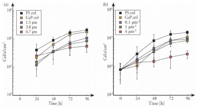 近年來科學(xué)家開始注意到納米陣列在生物方面的應(yīng)用,例如電極,生物傳感器,細(xì)胞注射及應(yīng)用于抗病菌方面,對理解納米線與細(xì)胞之間的關(guān)系提出了新的要求。這篇文章探討了細(xì)胞與納米線之間的相互作用,納米線是怎么影響細(xì)胞。我們研究了納米線的大小對細(xì)胞行為的影響。研究發(fā)現(xiàn)增加納米線的長度可以減少細(xì)胞遷移和干擾細(xì)胞分裂。細(xì)胞與50納米線相互結(jié)合抑制細(xì)胞的遷移。納米線密度的增加對細(xì)胞的遷移和分裂影響很小,當(dāng)納米線的密度超過2000納米線/細(xì)胞時(shí),細(xì)胞仍然與納米線的頂端結(jié)合,但是存在著細(xì)胞遷移。假設(shè)控制納米線的大小可以控制細(xì)胞遷移和增殖的程度。我們的研究結(jié)果可以進(jìn)一步用來限制納米線在細(xì)胞生物學(xué)中應(yīng)用的副作用。本研究所用的納米系統(tǒng)的好處之一就是GaP的帶隙能量大,使得波長在549nm以上的光可以透過。大部分其它的半導(dǎo)體基質(zhì)的帶隙能量低,不能透過光。