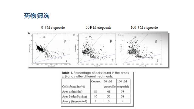 在藥物篩選方面,為驗(yàn)證藥物的藥效,可以對(duì)細(xì)胞不同處理后觀察細(xì)胞凋亡率來(lái)計(jì)算IC50值來(lái)反映新藥物的療效。上圖是經(jīng)etoposide不同濃度的處理后通過(guò)散點(diǎn)圖表示細(xì)胞的凋亡情況及細(xì)胞死亡數(shù)量的統(tǒng)計(jì)。