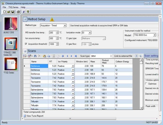 由于 Thermo ScientificTM TSQ 8000 Evo 采用 T-SRM 進(jìn)樣方法而不是分時間段的掃描方法,原來的進(jìn)樣的方法可以直接調(diào)用,即使保留時間會有微小的偏差,也不會影響最終的結(jié)果。另外,TraceFinder 軟件自帶的數(shù)據(jù)庫可以直接編輯數(shù)據(jù)處理方法,數(shù)據(jù)庫里包括化合物的名稱、離子對、碰撞能量、定量離子、定性離子、CAS 號等信息。同時,TraceFinder 軟件可以根據(jù)數(shù)據(jù)處理方法自動關(guān)聯(lián)生成 TSQ 8000 Evo 的方法文件。這樣應(yīng)用 TraceFinder 就可以直接生成數(shù)據(jù)處理方法和進(jìn)樣方法。整個過程都是自動化的,幾乎不需要操作者手動輸入任何操作信息。