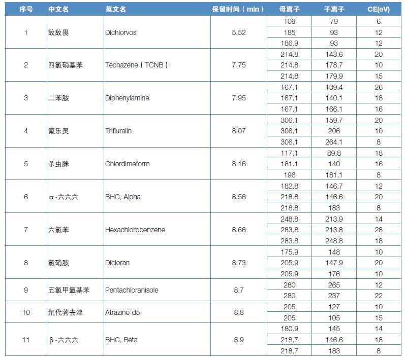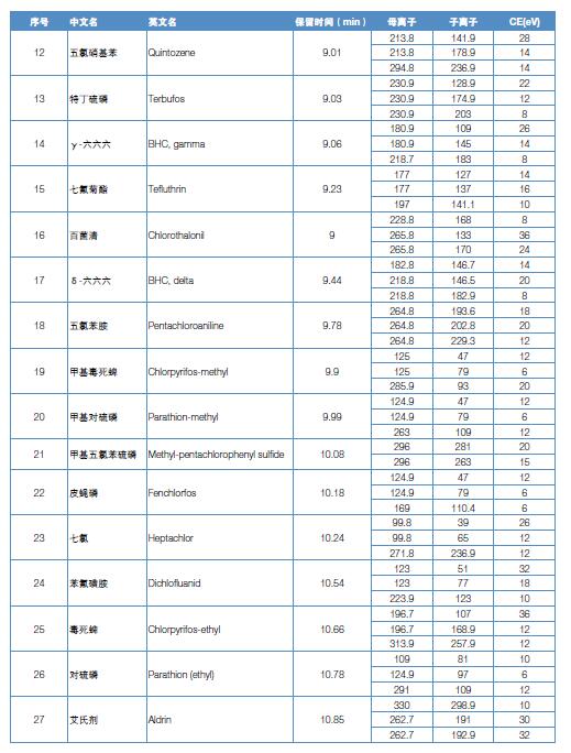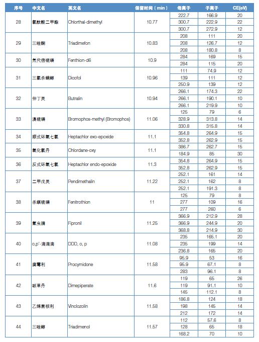 色譜柱:TR-Pesticide II 30 m*0.25 mm*0.25 μm 毛細(xì)管色譜柱(賽默飛世爾科技,美國);