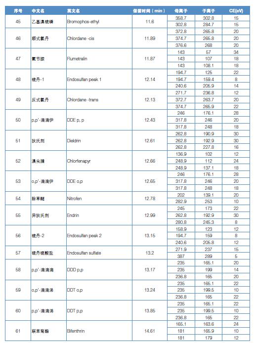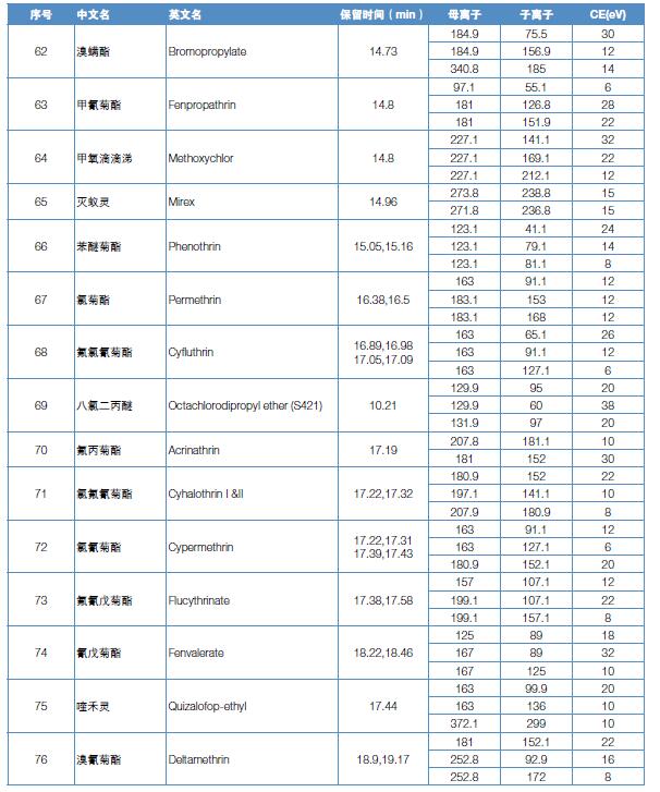 表 2. 76 種農(nóng)藥對照品、監(jiān)測離子對、碰撞電壓(CE)
