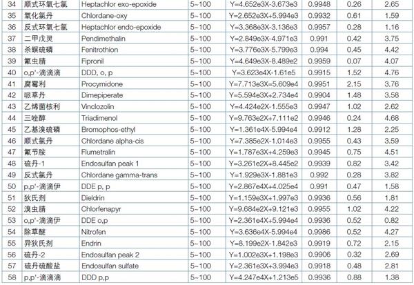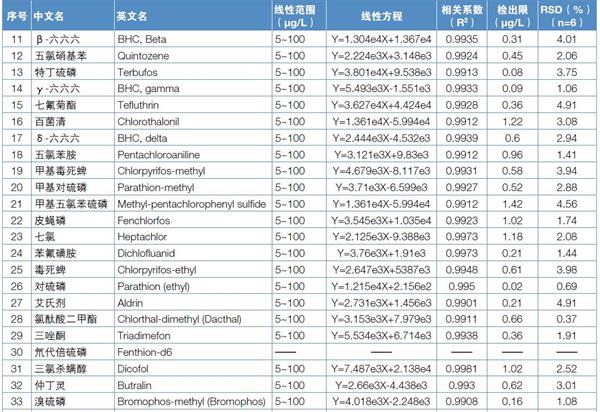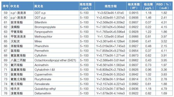 配置混合標(biāo)準(zhǔn)溶液,各濃度分別為:5.0、10.0、25.0、50.0、100.0 μg/L 采用上述方法分別進(jìn)樣分析,考察各組分的線性。實驗結(jié)果表明 74 種農(nóng)藥組分在 5.0~100.0 μg/L 線性關(guān)系良好,線性相關(guān)系數(shù)均大于 0.99, 對同一樣品連續(xù)進(jìn)樣 6 針,RSD 在0.37%–4.91%之間,重復(fù)性良好。按照IUPAC 方法規(guī)定計算各組分檢出限,各組分檢出限在 0.01–2.15 μg/L 之間,根據(jù)本應(yīng)用方法的前處理,其檢出限都滿足最新藥典對于農(nóng)殘分析檢出限的要求(見表 3)。