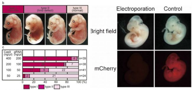 隨后,我們檢測(cè)了不同濃度的Cas9 mRNA和gRNA對(duì)于基因編輯的效率。200ng/ul Cas9 mRNA和50ng/u的gRNA,73%的胚胎無(wú)肢;100ng/ul Cas9 mRNA和50ng/ul的gRNA,32%展示肢體殘缺(圖2bc);50ng/ul Cas9 mRNA 和25ng/ul的gRNA,胚胎大多正常。
