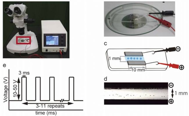 分別借助mCherry mRNA和無(wú)肢基因Fgf10進(jìn)行轉(zhuǎn)染,得到電轉(zhuǎn)受精卵存活并發(fā)育成兩細(xì)胞階段的比率是94-95%,比微注射方法(34-35%)要高很多。